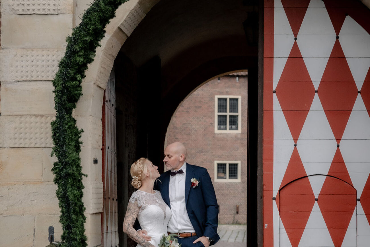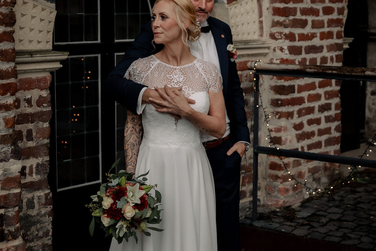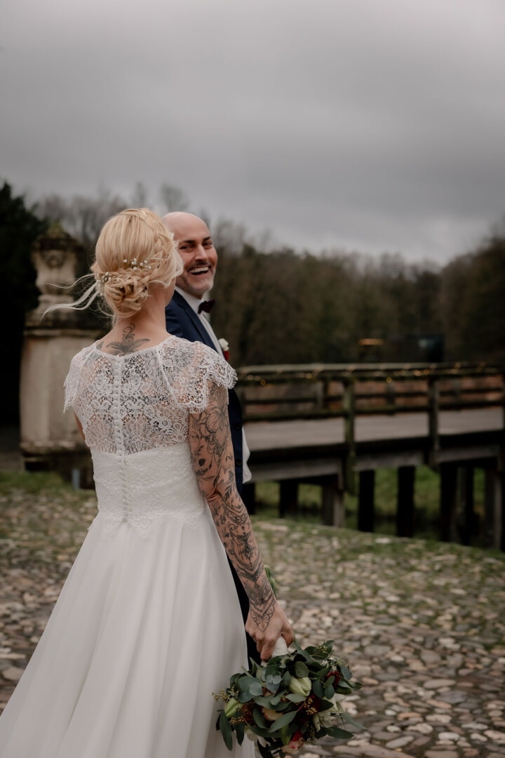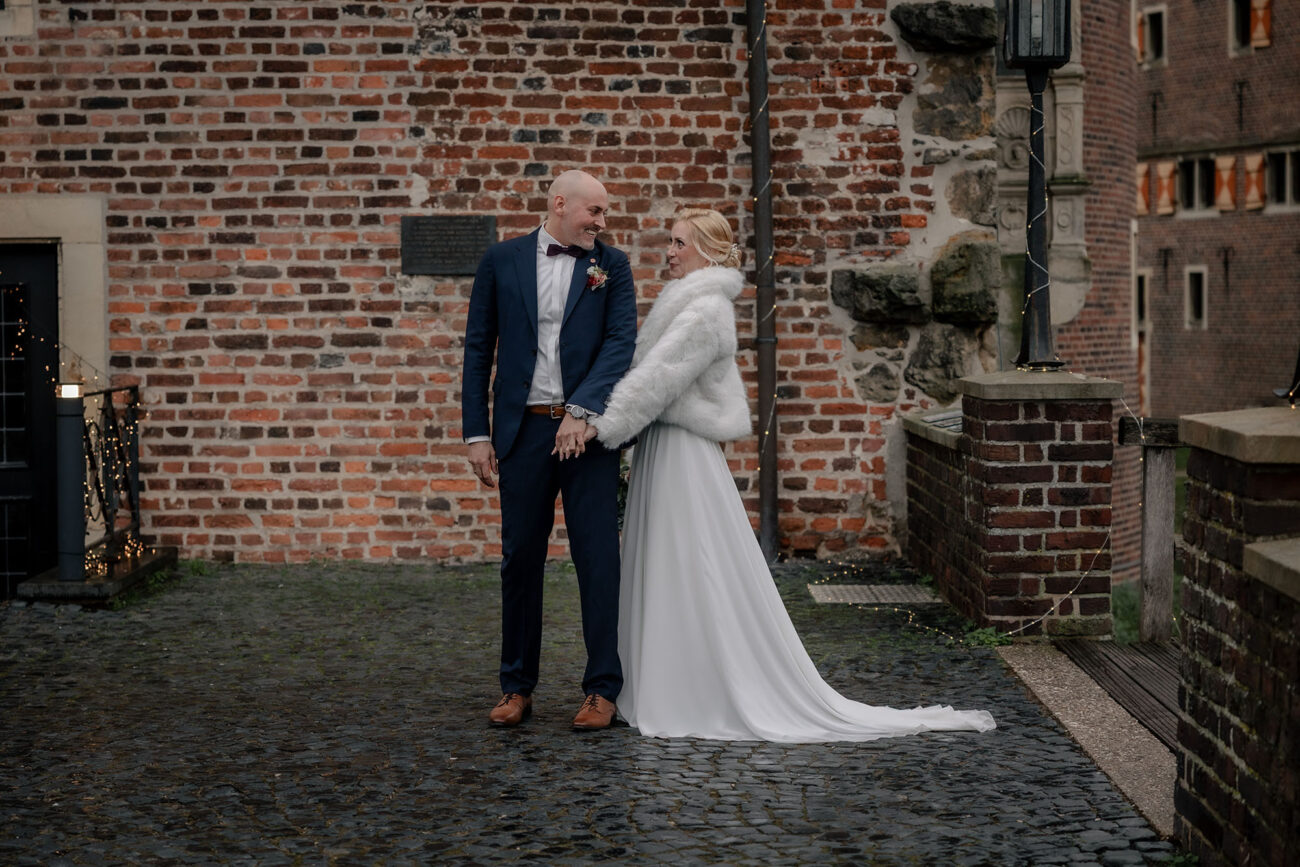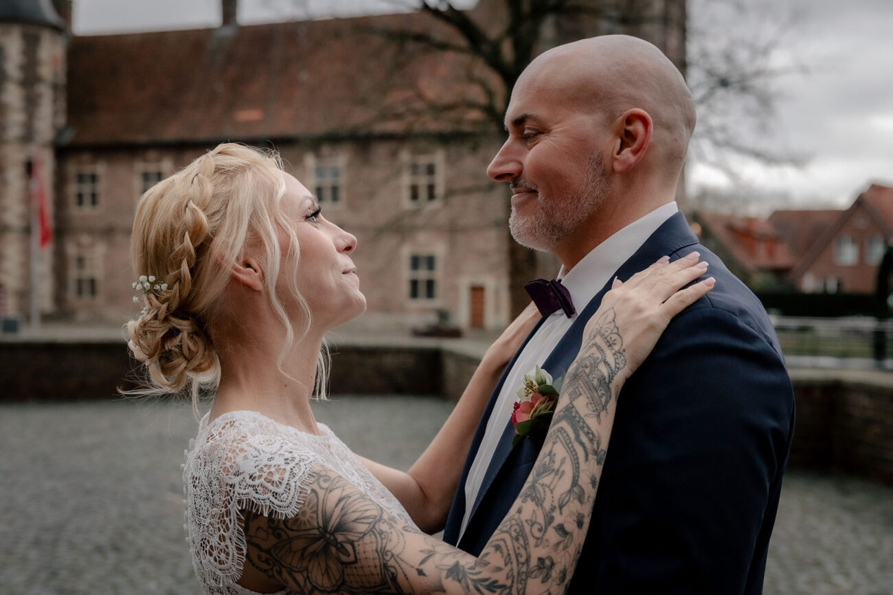 Der Tag begann mit dem First Look auf der Brücke von Schloss Raesfeld. Die winterliche Kälte war deutlich spürbar, doch die weihnachtlich geschmückte Kulisse sorgte für eine warme Stimmung. Lichterketten, floraler Schmuck und rote Weihnachtskugeln fingen das Licht ein und ließen das Schloss besonders einladend wirken. Als sich das Brautpaar hier zum ersten Mal sah, entstand ein ruhiger, sehr persönlicher Moment – voller Nähe, Freude und echter Verbundenheit.