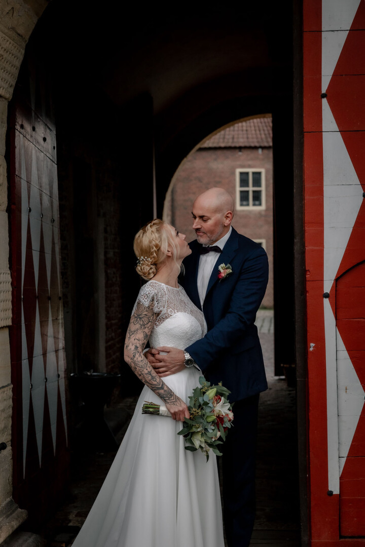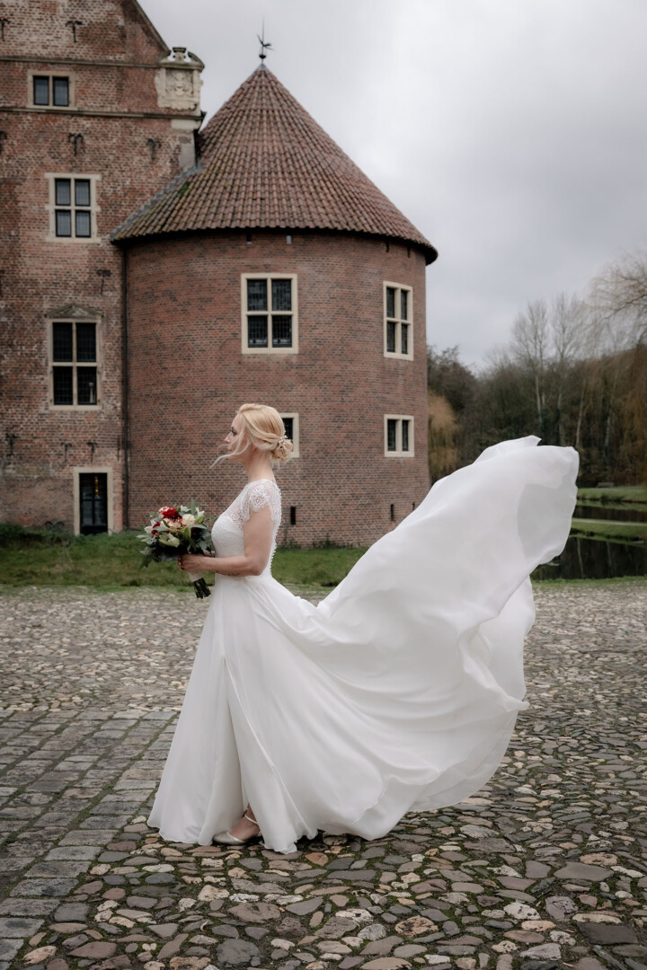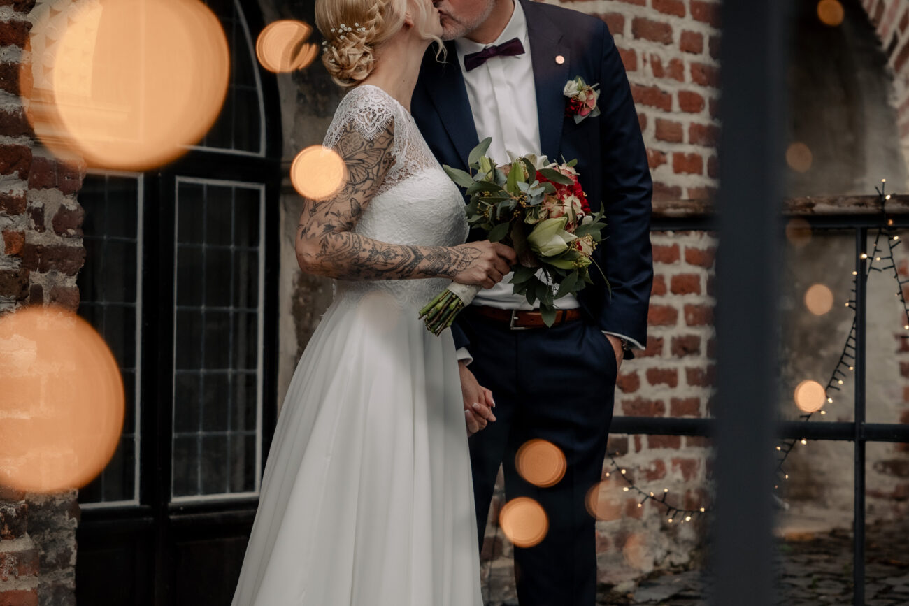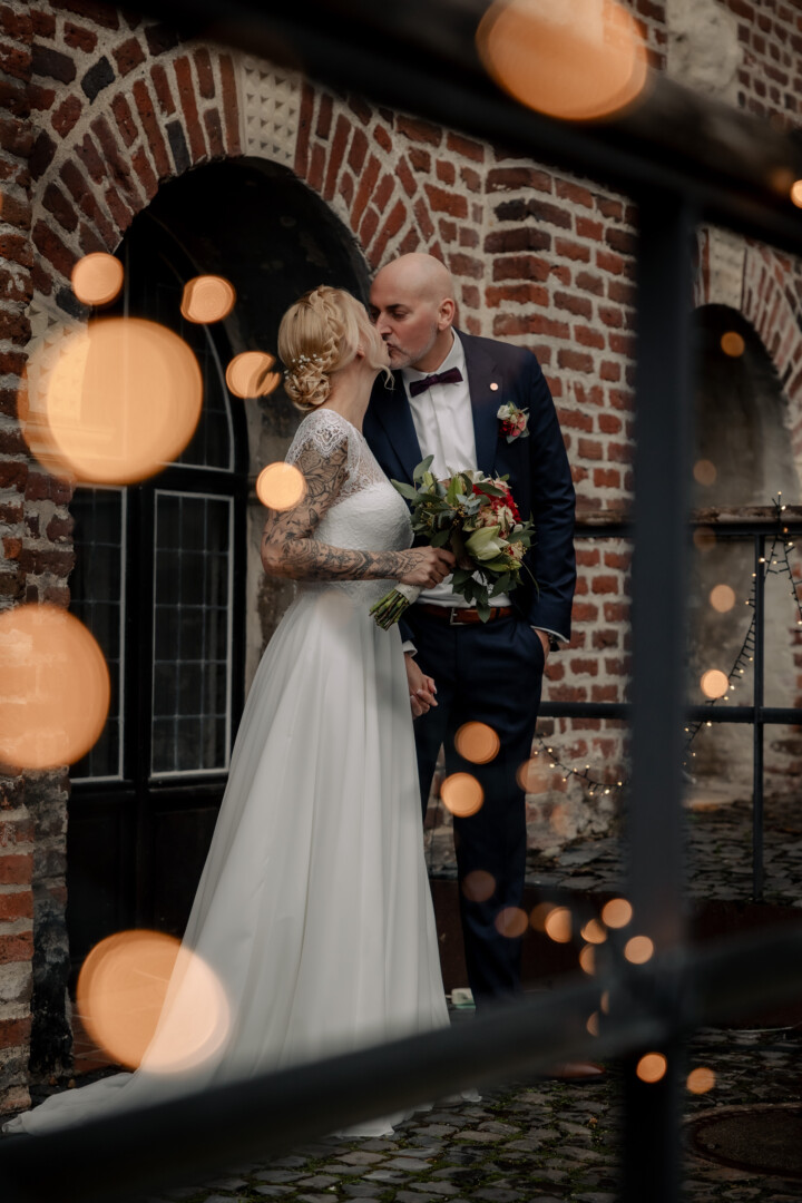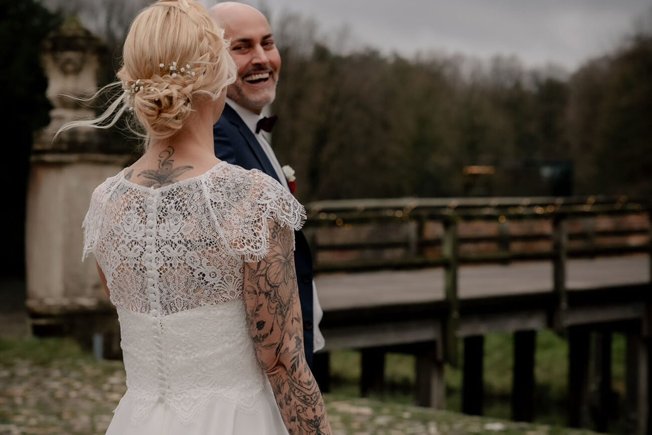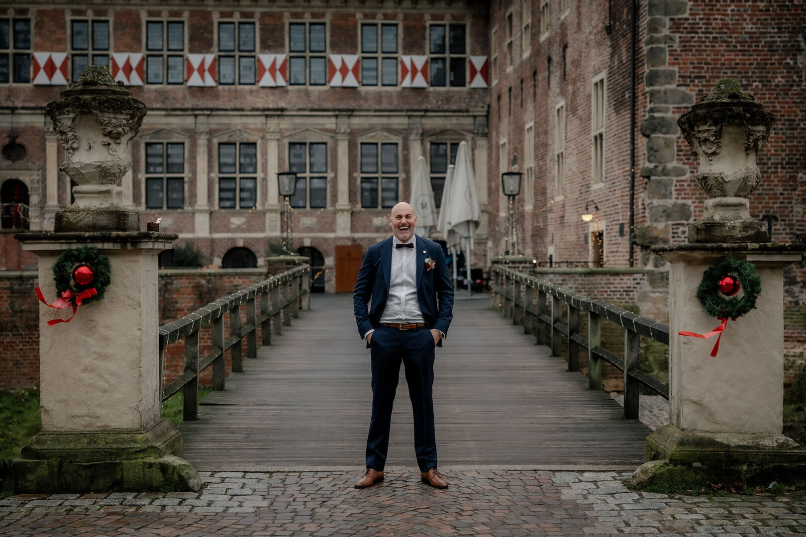 Der Tag begann mit dem First Look auf der Brücke von Schloss Raesfeld. Die winterliche Kälte war deutlich spürbar, doch die weihnachtlich geschmückte Kulisse sorgte für eine warme Stimmung. Lichterketten, floraler Schmuck und rote Weihnachtskugeln fingen das Licht ein und ließen das Schloss besonders einladend wirken. Als sich das Brautpaar hier zum ersten Mal sah, entstand ein ruhiger, sehr persönlicher Moment – voller Nähe, Freude und echter Verbundenheit.