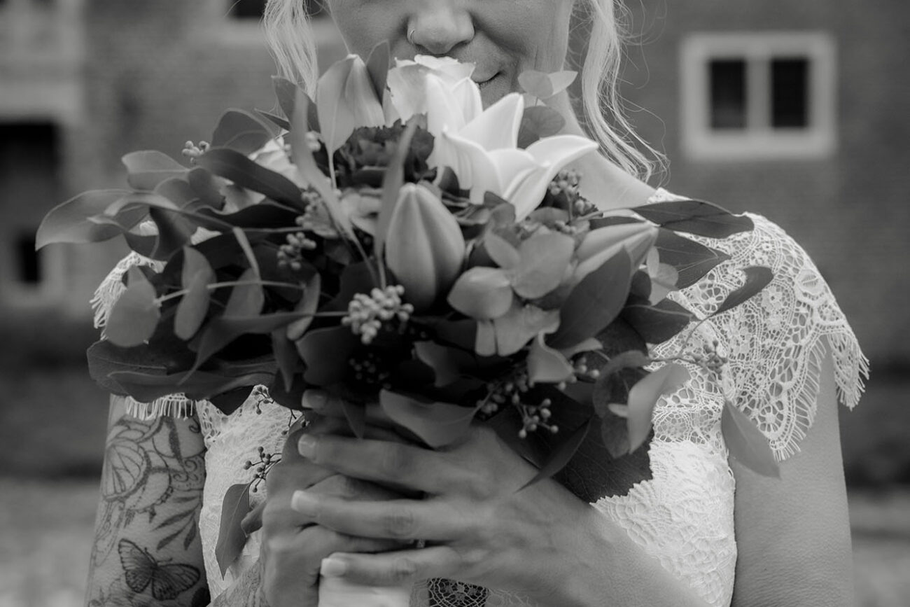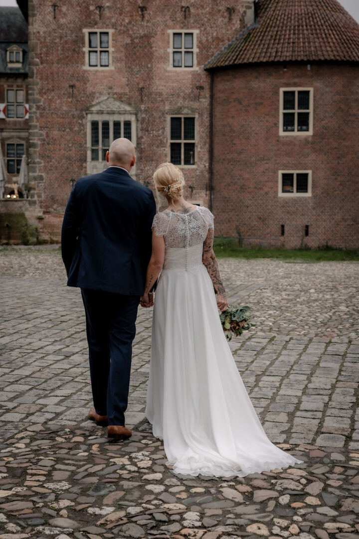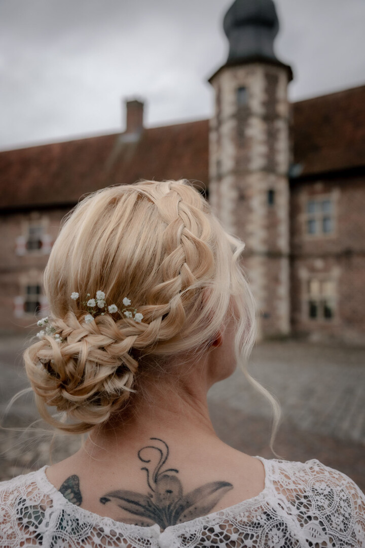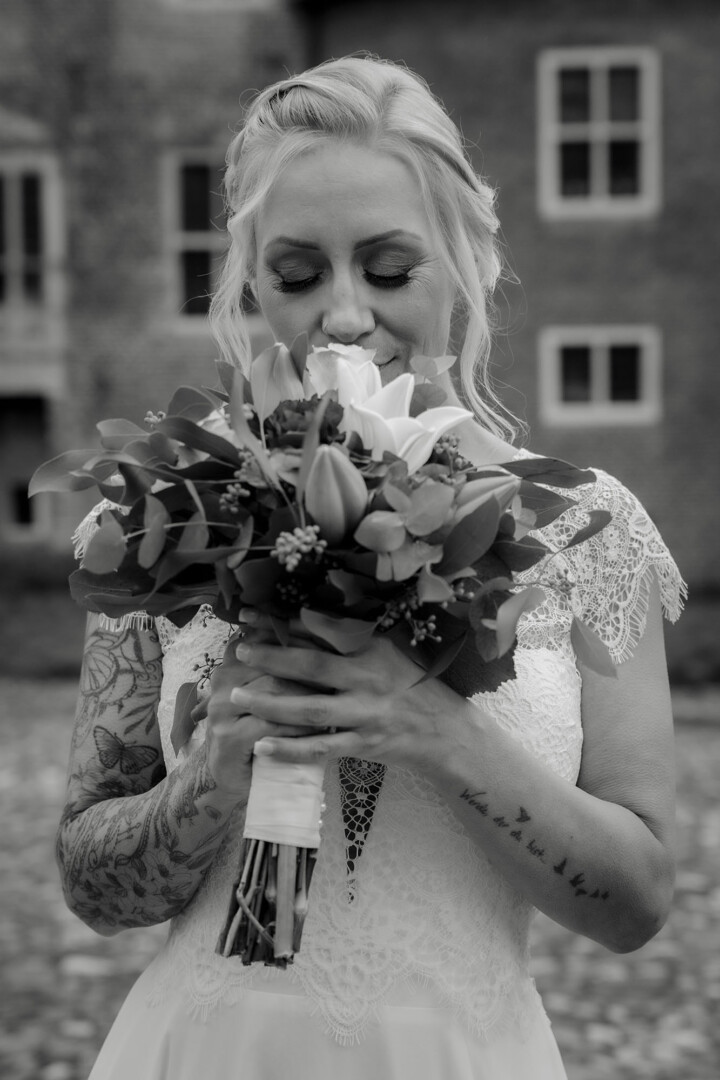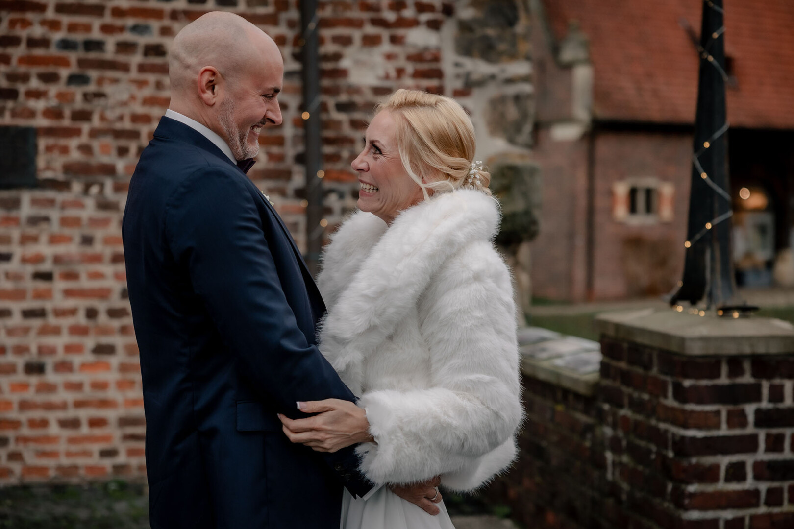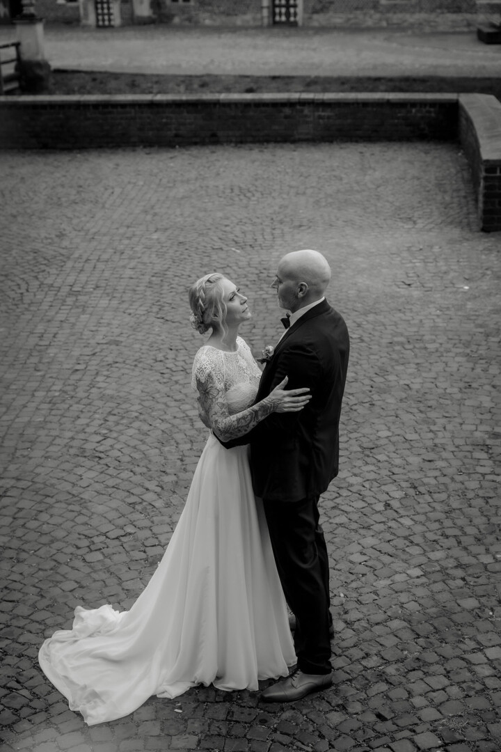 Der Tag begann mit dem First Look auf der Brücke von Schloss Raesfeld. Die winterliche Kälte war deutlich spürbar, doch die weihnachtlich geschmückte Kulisse sorgte für eine warme Stimmung. Lichterketten, floraler Schmuck und rote Weihnachtskugeln fingen das Licht ein und ließen das Schloss besonders einladend wirken. Als sich das Brautpaar hier zum ersten Mal sah, entstand ein ruhiger, sehr persönlicher Moment – voller Nähe, Freude und echter Verbundenheit.