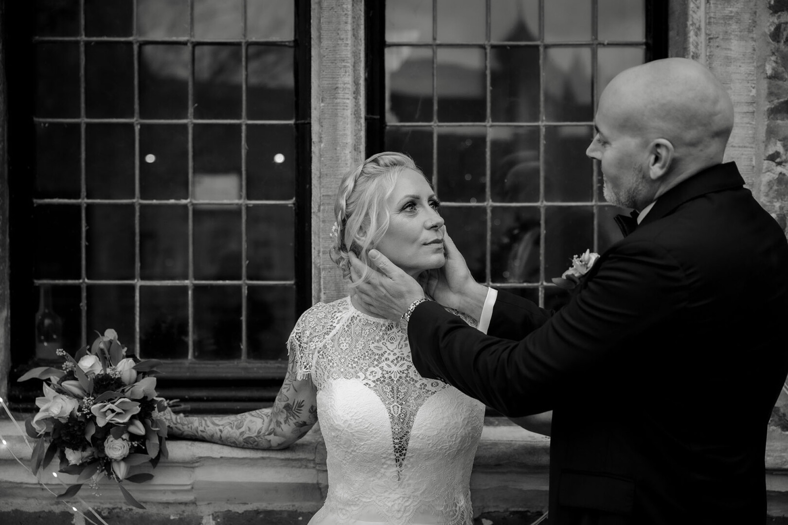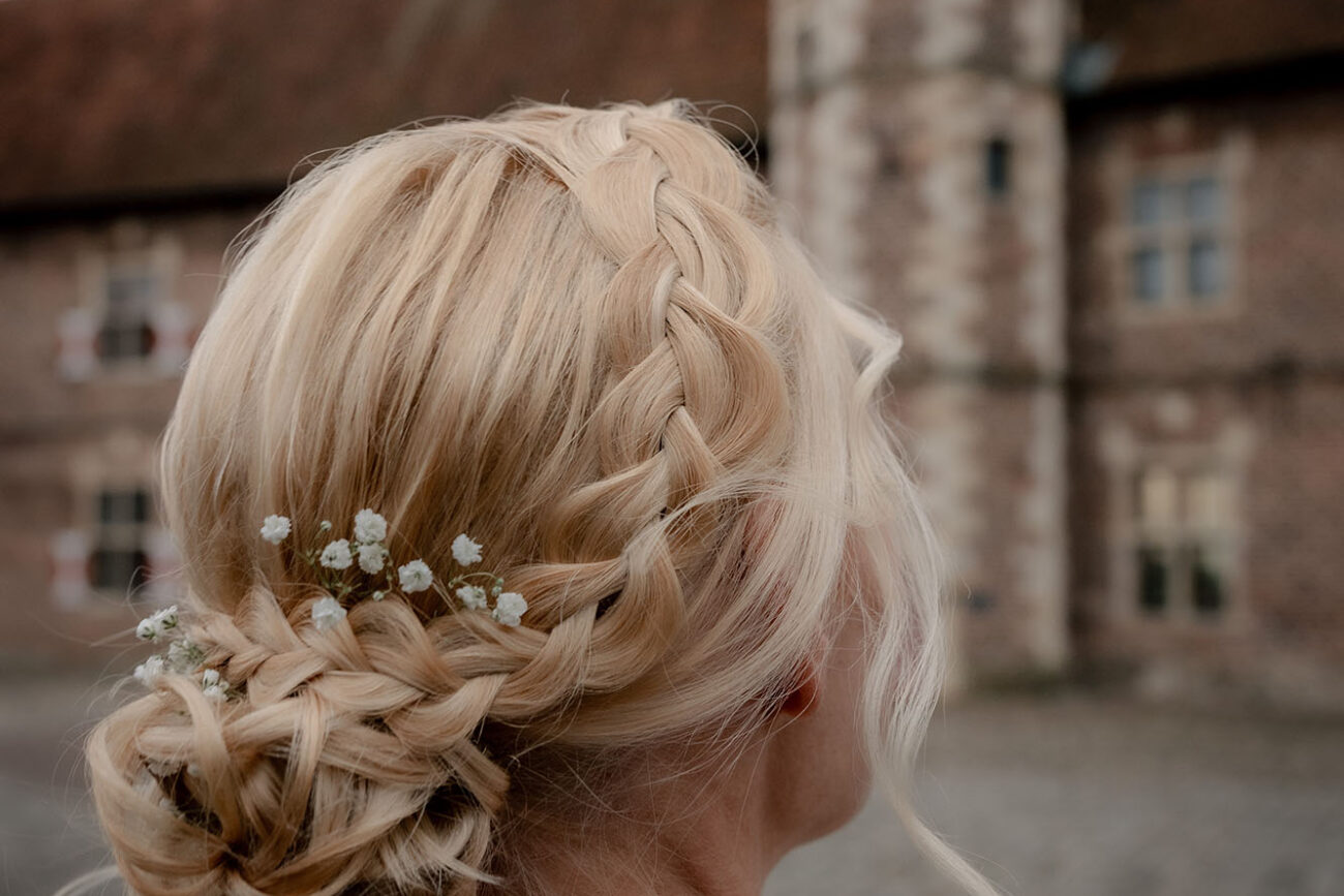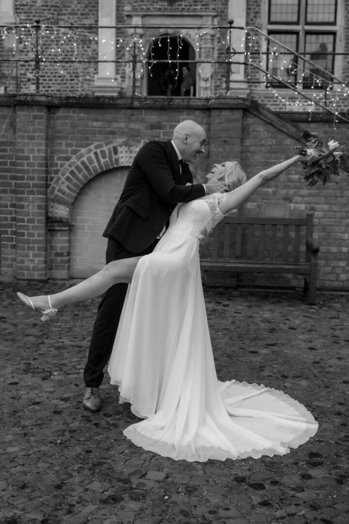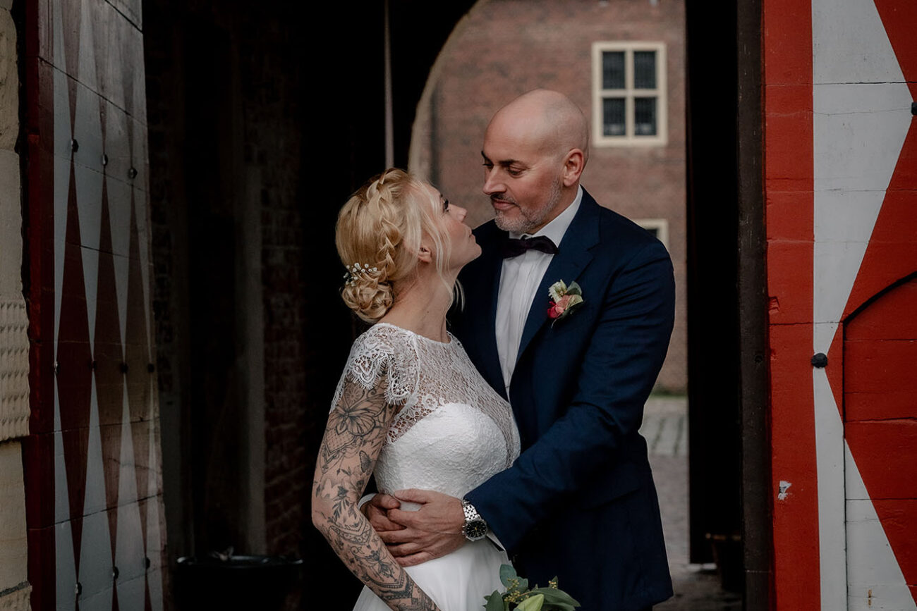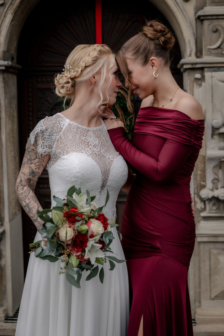 Der Tag begann mit dem First Look auf der Brücke von Schloss Raesfeld. Die winterliche Kälte war deutlich spürbar, doch die weihnachtlich geschmückte Kulisse sorgte für eine warme Stimmung. Lichterketten, floraler Schmuck und rote Weihnachtskugeln fingen das Licht ein und ließen das Schloss besonders einladend wirken. Als sich das Brautpaar hier zum ersten Mal sah, entstand ein ruhiger, sehr persönlicher Moment – voller Nähe, Freude und echter Verbundenheit.