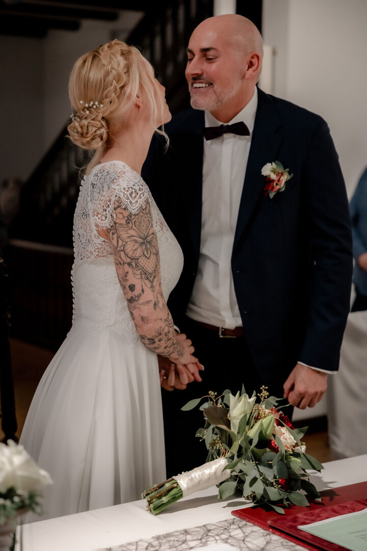 Die Trauung fand im Alten Rathaus Dorsten statt. Persönlich, emotional und dennoch angenehm ungezwungen. Kleine Gesten, vertraute Blicke und ein herzliches Miteinander prägten diesen Teil des Tages und machten die Zeremonie besonders authentisch.